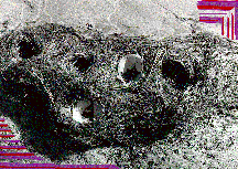 Nancy: Day 8. We woke up on the 8th day to another dawn chorus of melodious meadowlarks, virtuosic bushtits, piping finches, . . . We left early for Big Alice. This time we used electronics hooked up to Bob's VW battery. I walked down the beach and found big clumps of mown grass that had washed up along the shoreline. I kept getting images of birds coming and going, taking the slender blades from the clumps for their nests. This idea inspired me to hollow out bird places in the grass. I lined some of the holes with little bright yellow leaves. When I walked back in the direction in which I had come, I found Bob in a sort of trance making sounds into his microphone, processed by electronics, and interacting with the songs of birds, wind and water sounds. I moved about the beach listening to the echoing birds. At one point, I made another installation that was caused by my dance movements. The center of the piece in a large rock in a hole that I dug with the rock. I had been using the rock and all of its weight to swing me in my dance. The hole has marks radiating from it that were formed by my dancing the sand away with my hands. I call the piece "Part of a Dance".