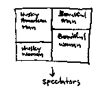 I was teaching a class to four people: three Iranians (one slim man, one slim woman, and a husky woman) and one husky quiet American man. They were given one half of a football stadium and told to create their utopias. The other half was for spectators (myself). All of the bleachers on the class' half were halved again and then divided again almost into quarters so that each student would have his/her own space. Please refer to the following diagram: